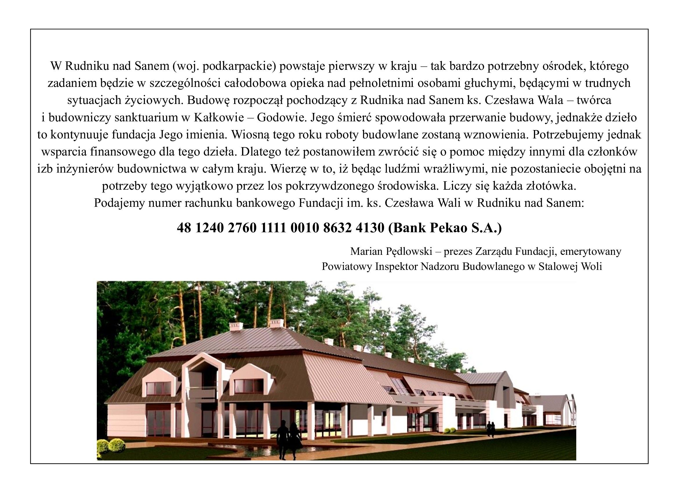Koleżanki i Koledzy, powstaje pierwszy w kraju ośrodek dla pełnoletnich osób niesłyszących, budowany przez Fundację im. ks. Czesława Walę. Potrzebne jest jednak wsparcie finansowe dla tego zadania. O pomoc zwrócił się Marian Pędlowski - emerytowany Powiatowy Inspektor Nadzoru Budowlanego w Stalowej Woli, rekomendowany wykładowca Polskiej Izby Inżynierów Budownictwa, a obecnie prezes Zarządu Fundacji. Nie pozostańmy obojętni na ten apel. Dołóżmy swoje cegiełki do tego dzieła. |
