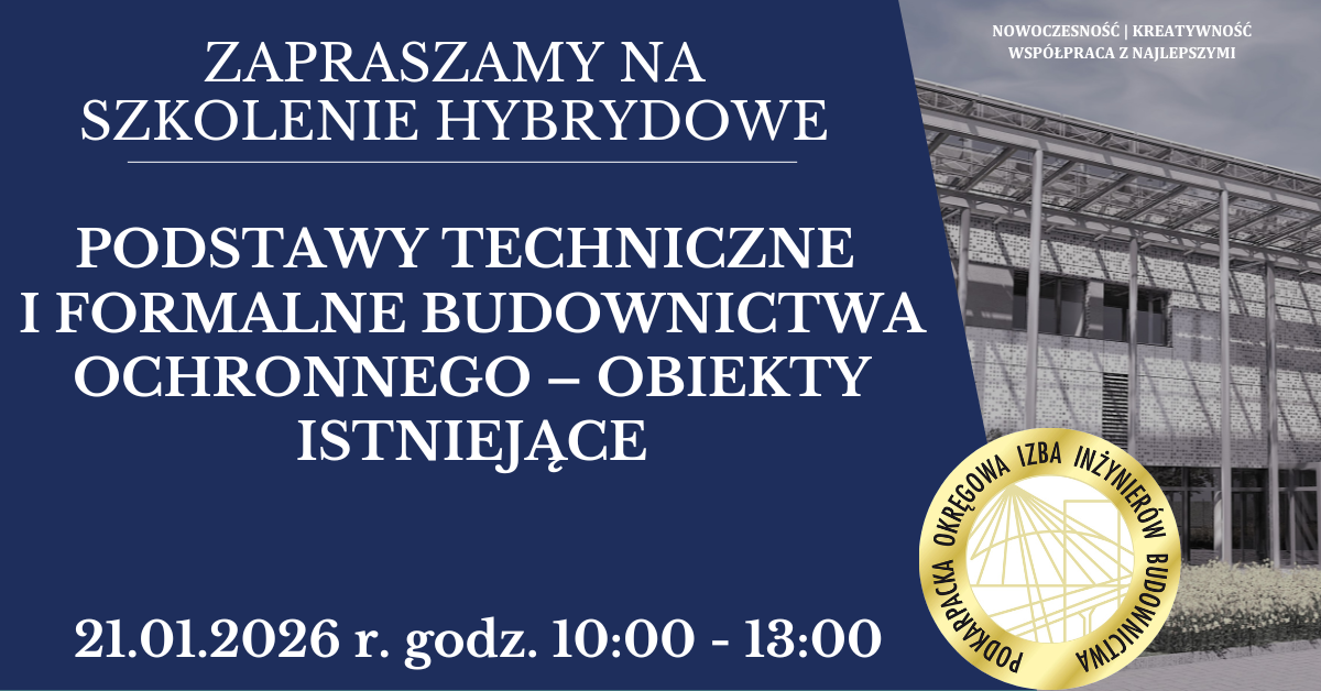 | Szkolenie hybrydowe PDK OIIB - Podstawy techniczne i formalne budownictwa ochronnego - obiekty istniejące - 21.01.2026 r. |