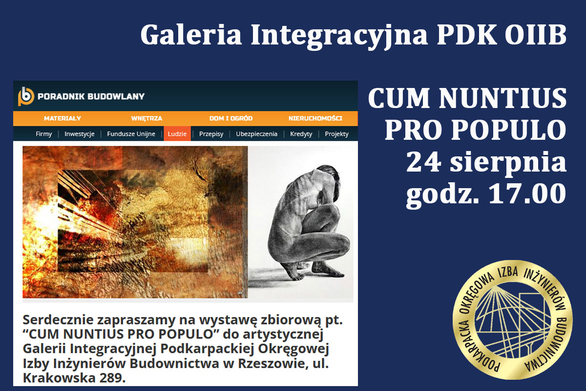Serdecznie zapraszamy na wystawę zbiorową pt. "CUM NUNTIUS PRO POPULO". Wernisaż odbędzie się w dniu 24 sierpnia o godz. 17.00. Uroczysty finisaż odbędzie się w dniu 18 października 2024 r. o godz.18.00. Poradnik budowlany wspiera nas medialnie >> |