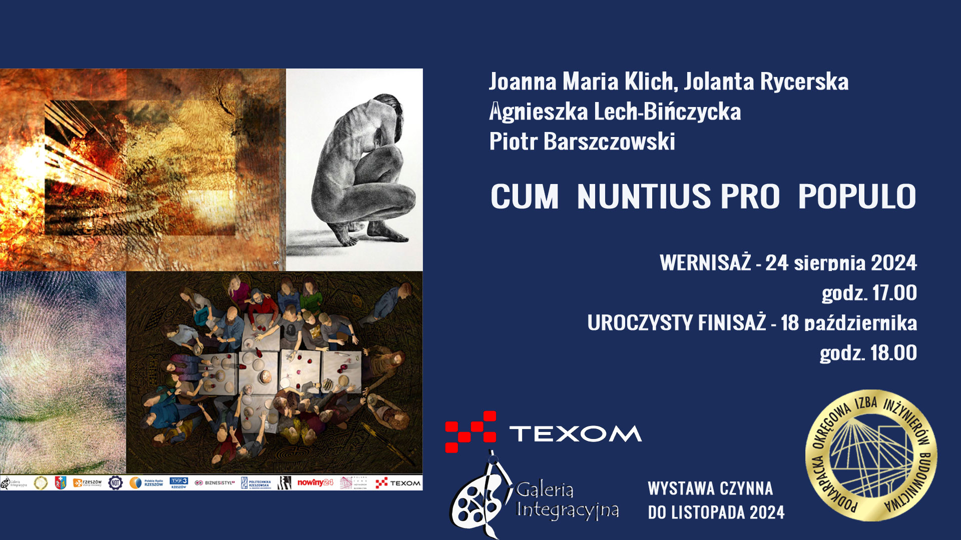 Serdecznie zapraszamy na wystawę zbiorową pt. "CUM NUNTIUS PRO POPULO" do artystycznej Galerii Integracyjnej Podkarpackiej Okręgowej Izby Inżynierów Budownictwa w Rzeszowie. Wernisaż odbędzie się w dniu 24 sierpnia o godz. 17.00. Uroczysty finisaż odbędzie się w dniu 18 października 2024 r. o godz.18.00. ...więcej>> |