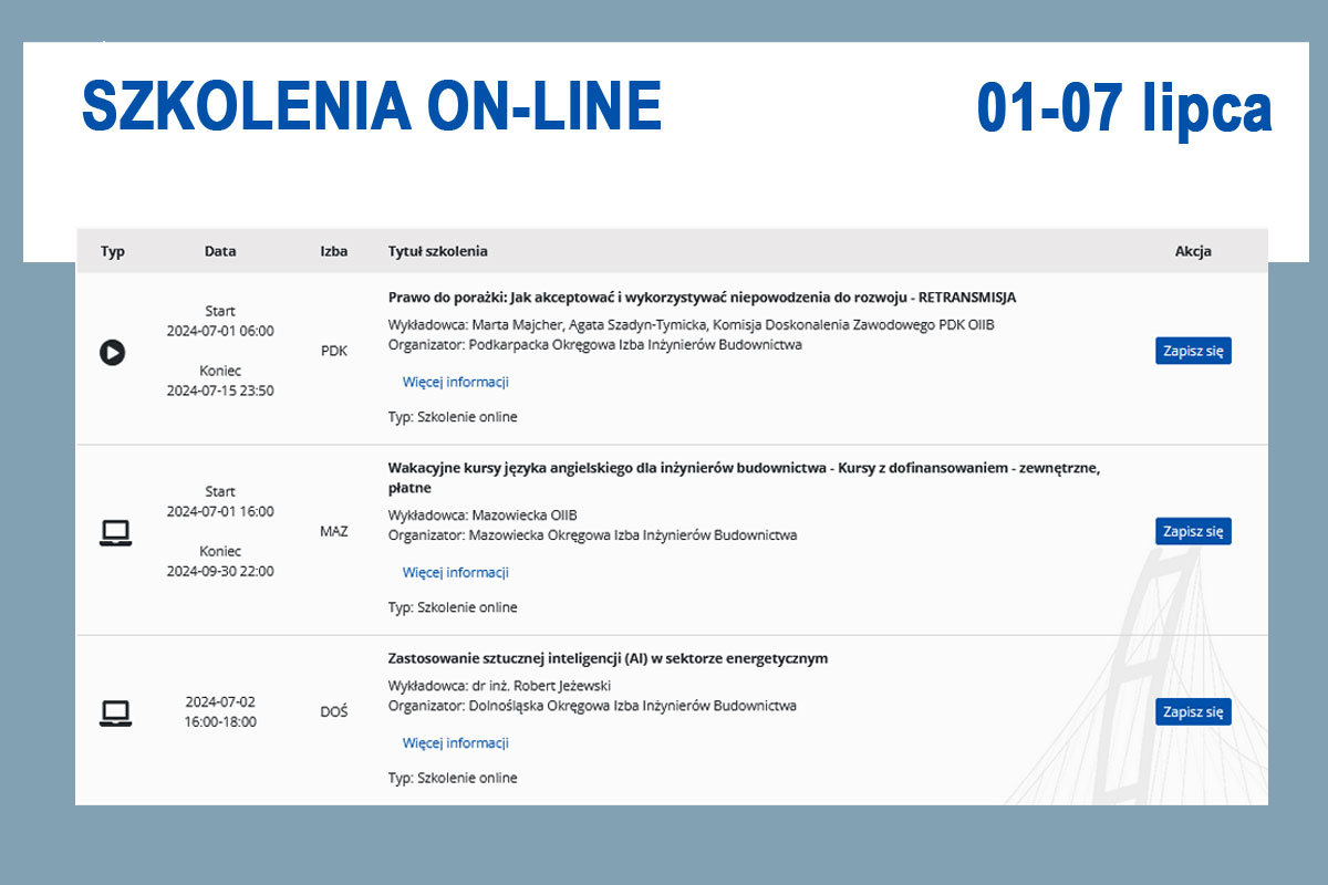 Szkolenia dla członków Polskej Izby Inżynierów Budownictwa. Start 2024-07-01 06:00 Koniec 2024-07-15 23:50 PDK. Prawo do porażki: Jak akceptować i wykorzystywać niepowodzenia do rozwoju - RETRANSMISJA Wykładowca: Marta Majcher, Agata Szadyn-Tymicka, Komisja Doskonalenia Zawodowego PDK OIIB. |