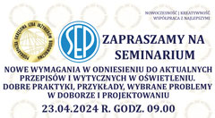 | Seminarium SEP i PDK OIIB - Nowe wymagania w odniesieniu do aktualnych przepisów i wytycznych w oświetleniu. Dobre praktyki, przykłady, wybrane problemy w doborze i projektowaniu - 23.04.2024 r. |