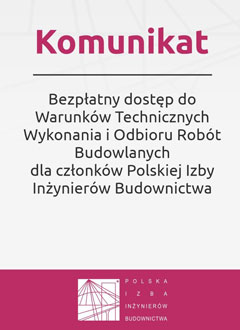 Członkowie Polskiej Izby Inżynierów Budownictwa otrzymali bezpłatny dostęp do Warunków Technicznych Wykonania i Odbioru Robót Budowlanych przygotowanych przez Instytut Techniki Budowlanej. Dostęp do materiałów dla członków samorządu możliwy jest zarówno przez portal PIIB jak i aplikację Polskiej Izby Inżynierów Budownictwa.
