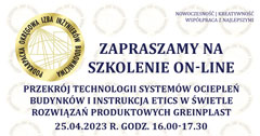 | Szkolenie on-line PDK OIIB -Przekrój technologii systemów ociepleń budynków i instrukcja ETICS w świetle rozwiązań produktowych GREINPLAST - 25.04.2023 r. |