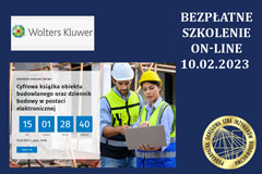 Firma Wolters Kluwer Polska zaprasza w dniu 10.02.2023 r. na bezpłatne szkolenie online „Cyfrowa książka obiektu budowlanego oraz dziennik budowy w postaci elektronicznej". Dowiesz się o najnowszych zmianach w procesie inwestycyjnym związanych z wprowadzeniem systemu c-KOB i EDB, czyli cyfrowej książki obiektu budowlanego oraz dziennika budowy w postaci elektronicznej. ...więcej> > |
