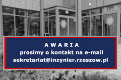 W związku z problemami technicznymi z telefonami stacjonarnymi, prosimy wszystkie sprawy i zapytania kierować na adres e-mailowy: sekretariat@inzynier.rzeszow.pl. Awaria została zgłoszona u operatora. Za utrudnienia przepraszamy.