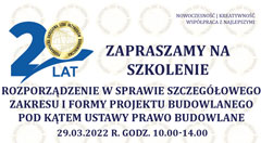 Podkarpacka Okręgowa Izba Inżynierów Budownictwa zaprasza na szkolenie stacjonarne: Rozporządzenie W SPRAWIE SZCZEGÓŁOWEGO ZAKRESU I FORMY PROJEKTU BUDOWLANEGO pod kątem ustawy PRAWO BUDOWLANE w dniu 29 marca 2022 r., w godz. 10:00-14:00 w siedzibie Izby, ul. Krakowska 289, 35-213 Rzeszów. więcej »