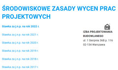 Izba Projektowania Budowlanego w dniu 26 października 2021 r. przyjęła następujące postanowienie: wysokość stawki za umowną jednostkę nakładu pracy (j.n.p.), przy wycenach dokonywanych w roku 2022 na podstawie Środowiskowych Zasad Wycen Prac Projektowych, ustala się na S = 22,35 zł.W stawce tej nie jest uwzględniony podatek VAT, który nalicza się od wartości świadczonych usług. |