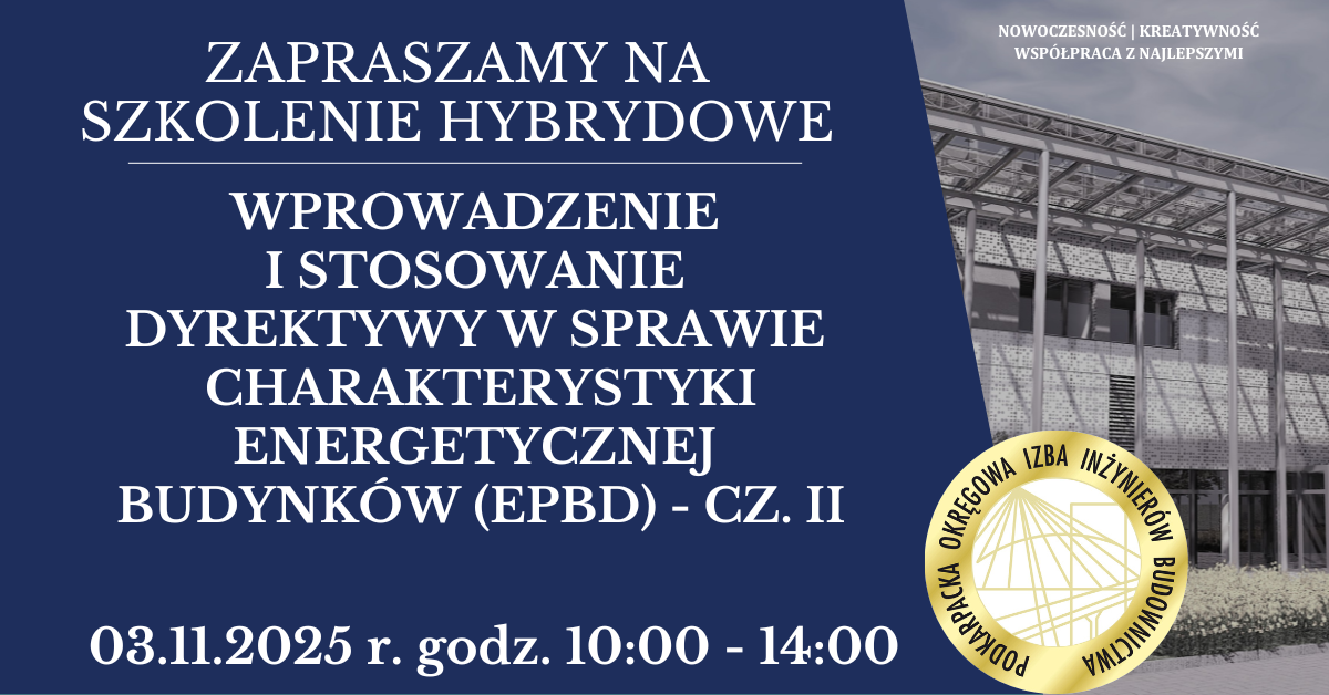 | Szkolenie hybrydowe PDK OIIB - Wprowadzenie i stosowanie dyrektywy w sprawie charakterystyki energetycznej budynków (EPBD) - cz. II - 03.11.2025 r. |