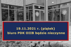 Uprzejmie informujemy, że w dniu 19.11.2021 r. (piątek) z powodu egzaminu testowego na uprawnienia budowlane i Gali finałowej konkursu Budowa Roku Podkarpacia 2020 biuro PDK OIIB będzie nieczynne. Za wszelkie utrudnienia przepraszamy. |