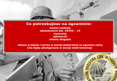 Czekamy na Was na egzaminie w Hotelu Rzeszów mieszczącym się na 2/3 piętrze Galerii Rzeszów, Al. J. Piłsudskiego 44 w Sali konferencyjnej. Prosimy pamiętać, aby wziąć ze sobą na egzaminy: -dowód osobisty -oświadczenie dot. COVID - 19 -maseczkę -rękawiczki -własny długopis -własne przepisy i normy w wersji papierowej na egzamin ustny (nie będą udostępniane w wersji elektronicznej) |