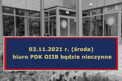 Uprzejmie informujemy, że w dniu 03.11.2021 r. (środa) biuro PDK OIIB będzie nieczynne. Za wszelkie utrudnienia przepraszamy.