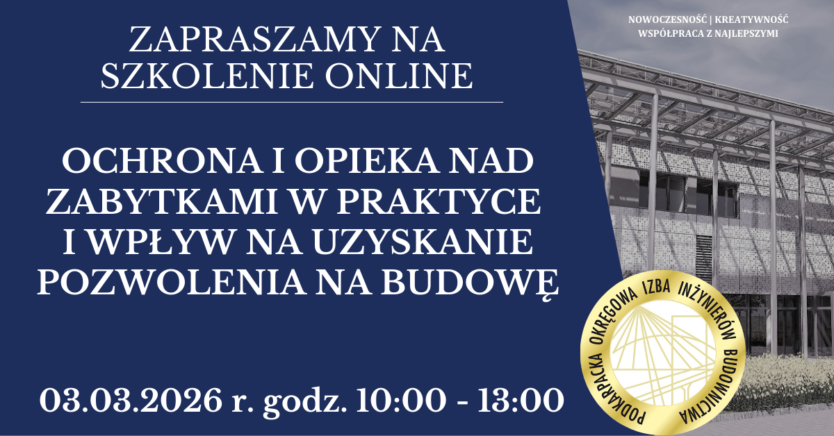 | Szkolenie on-line PDK OIIB - Ochrona i opieka nad zabytkami w praktyce i wpływ na uzyskanie pozwolenia na budowę - 03.03.2026 r. |