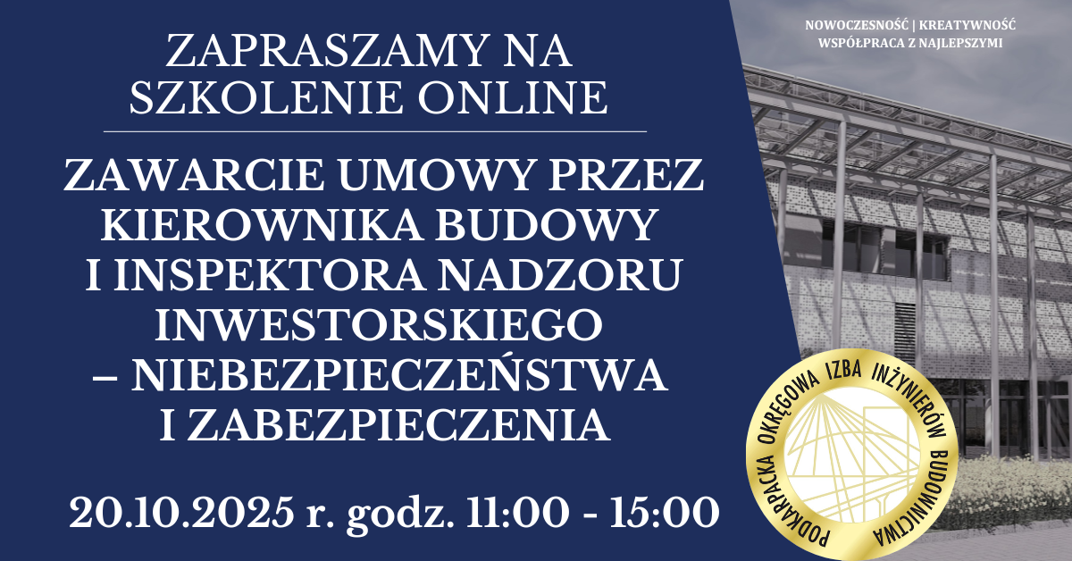 | Szkolenie on-linie PDK OIIB - Zawarcie umowy przez kierownika budowy i inspektora nadzoru inwestorskiego – niebezpieczeństwa i zabezpieczenia - 20.10.2025 r. |