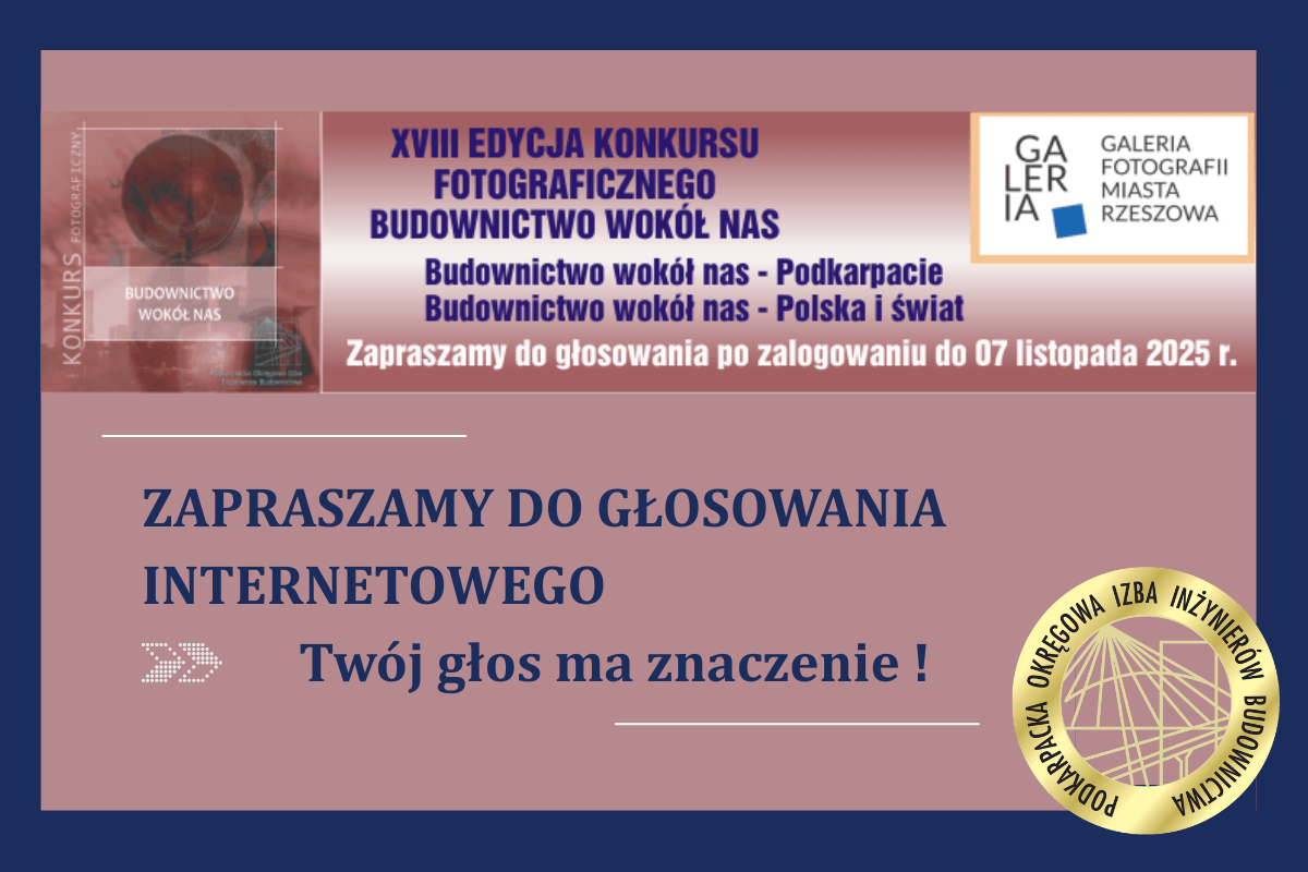Zapraszamy oddawania swoich głosów po zalogowaniu na przesłane fotografie w XVIII edycji konkursu fotograficznego „Budownictwo wokół nas". Na stronie portalu została zamieszczona galeria z wszystkimi fotografiami przesłanymi przez uczestników konkursu. Każdy członek może oddać po zalogowaniu po 1 głosie w terminie do 07 listopada 2025 r. w dwóch kategoriach: ...więcej>>