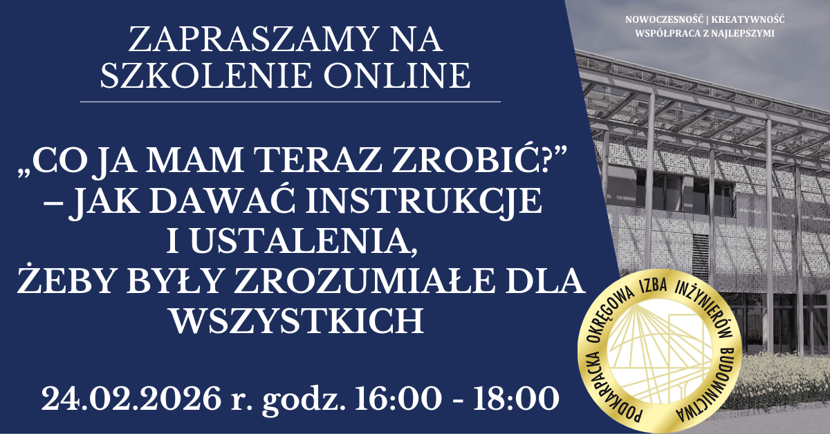 | Szkolenie on-line PDK OIIB - Co ja mam teraz zrobić? – jak dawać instrukcje i ustalenia, żeby były zrozumiałe dla wszystkich - 24.02.2026 r. |