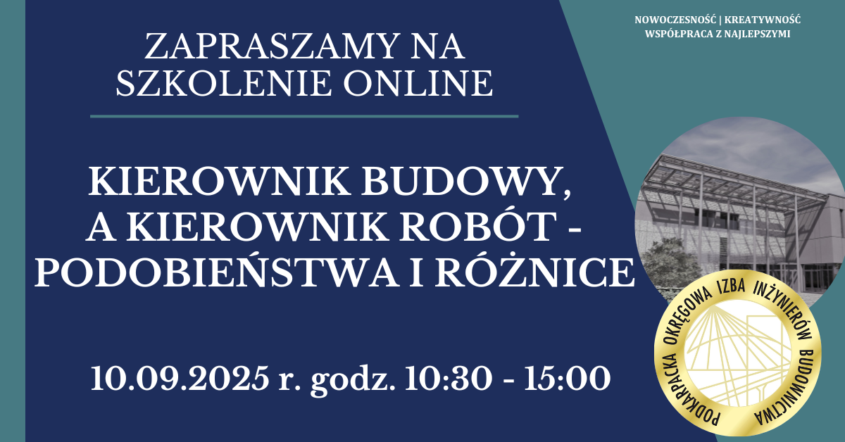 | Szkolenie on-line PDK OIIB - Kierownik budowy, a kierownik robót - podobieństwa i różnice - 10.09.2025 r. |