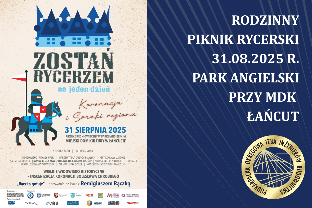 Zapraszamy do udziału w Rodzinnym Pikniku Rycerskim organizowanym przez Partnera Izby 31 sierpnia 2025, w godz. 13:00-18:00, Park Angielski przy MDK w Łańcucie. Ciekawy pomysł na pożegnanie lata. Dajcie znać po wydarzeniu, czy Izba powinna się zaangażować w tego typu pikniki w przyszłym roku na naszego e-maila: organizacja@inzynier.rzeszow.pl. Czekamy na Wasze opinie! ...więcej>> Pobierz załącznik :Program_Piknik_Rycerski |