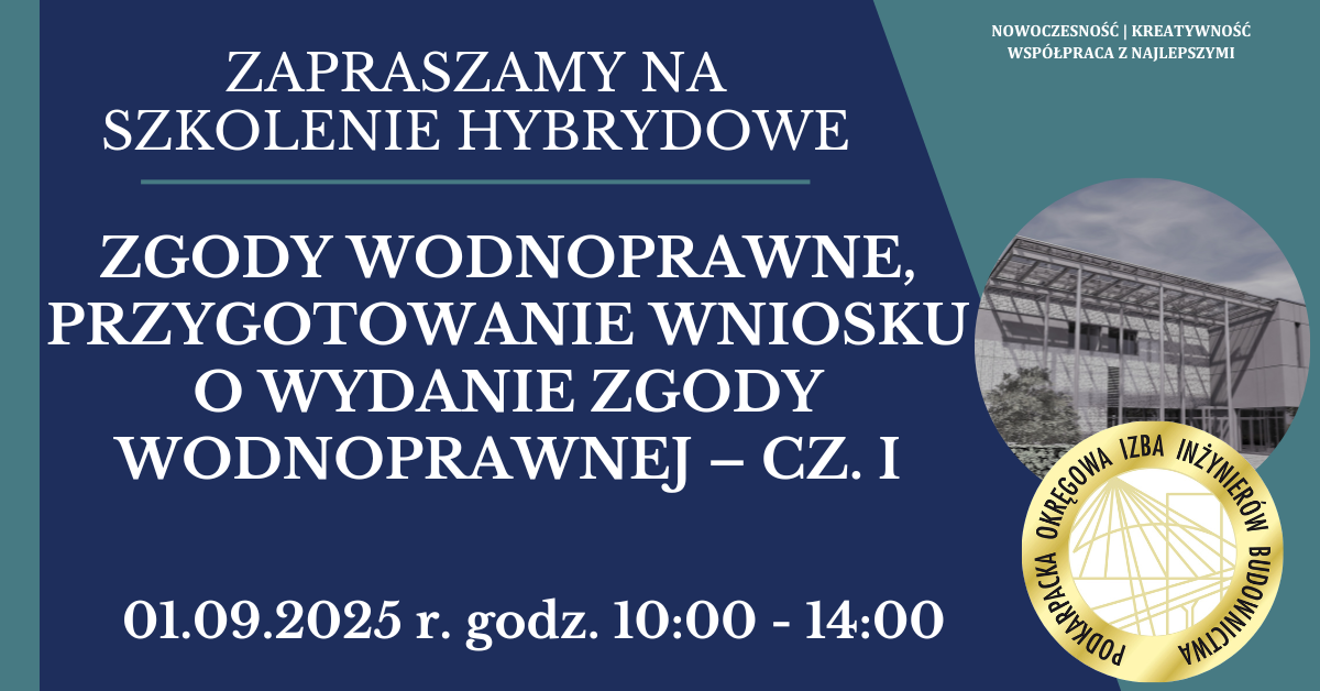 | Szkolenie hybrydowe PDK OIIB - Zgody wodnoprawne, przygotowanie wniosku o wydanie zgody wodnoprawnej - cz. I - 01.09.2025 r. |