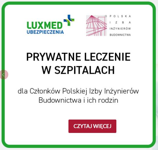 Program Ubezpieczenia Szpitalnego dla Członków Polskiej Izby Inżynierów Budownictwa oraz członków ich rodzin. Nowy program został przygotowany przez LUX MED Ubezpieczenia, przy współpracy z Polską Izbą Inżynierów Budownictwa. Ubezpieczenie Szpitalne LUX MED oferuje koordynację i organizację hospitalizacji pilnej lub planowej, możliwość leczenia w prywatnych szpitalach Grupy LUX MED i placówkach współpracujących, wizyty kontrolne po hospitalizacji i rehabilitację pozabiegową. ...więcej>> |