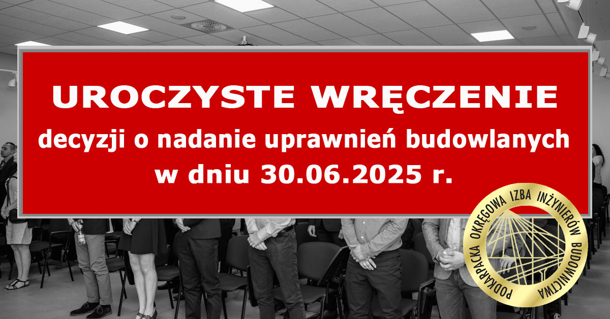 Uroczyste wręczenie decyzji o nadaniu uprawnień budowlanych odbędzie się 30 czerwca 2025 r. o godzinie 10.00 w siedzibie Podkarpackiej Okręgowej Izby Inżynierów Budownictwa w Rzeszowie, przy ul. Krakowskiej 289, dla wszystkich specjalności: - specjalności konstrukcyjno-budowlanej, hydrotechnicznej - specjalności sanitarnej, drogowej, mostowej - specjalności elektrycznej, kolejowej