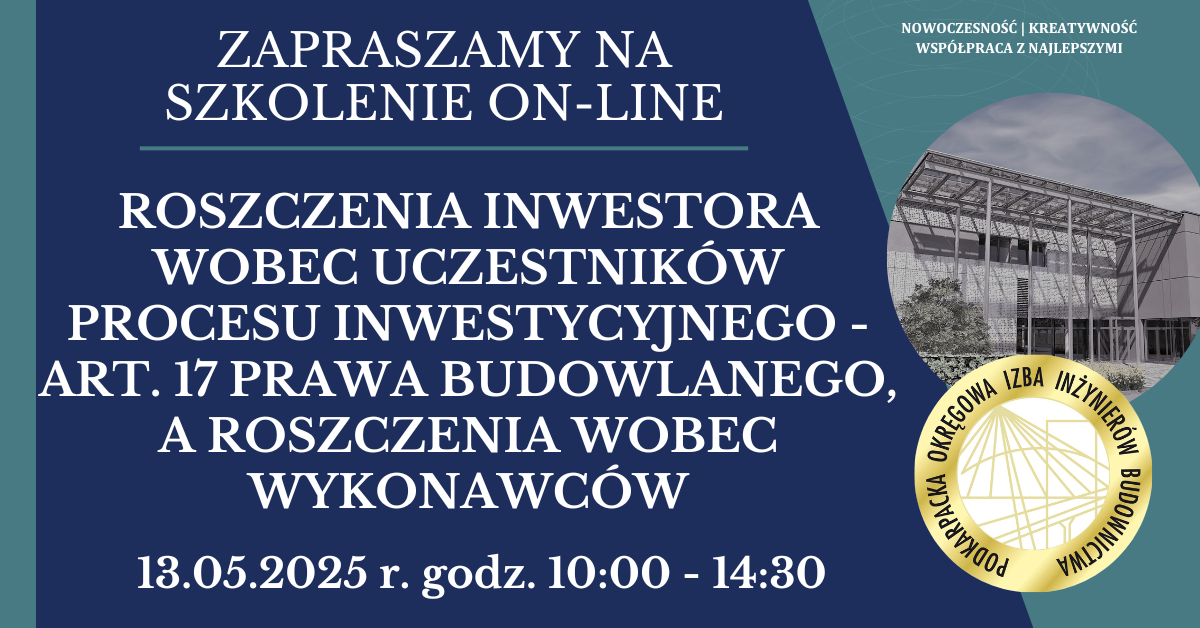 | Szkolenie on-line PDK OIIB - Roszczenia inwestora wobec uczestników procesu inwestycyjnego - art. 17 Prawa Budowlanego, a roszczenia wobec wykonawców - 13.05.2025 r. |