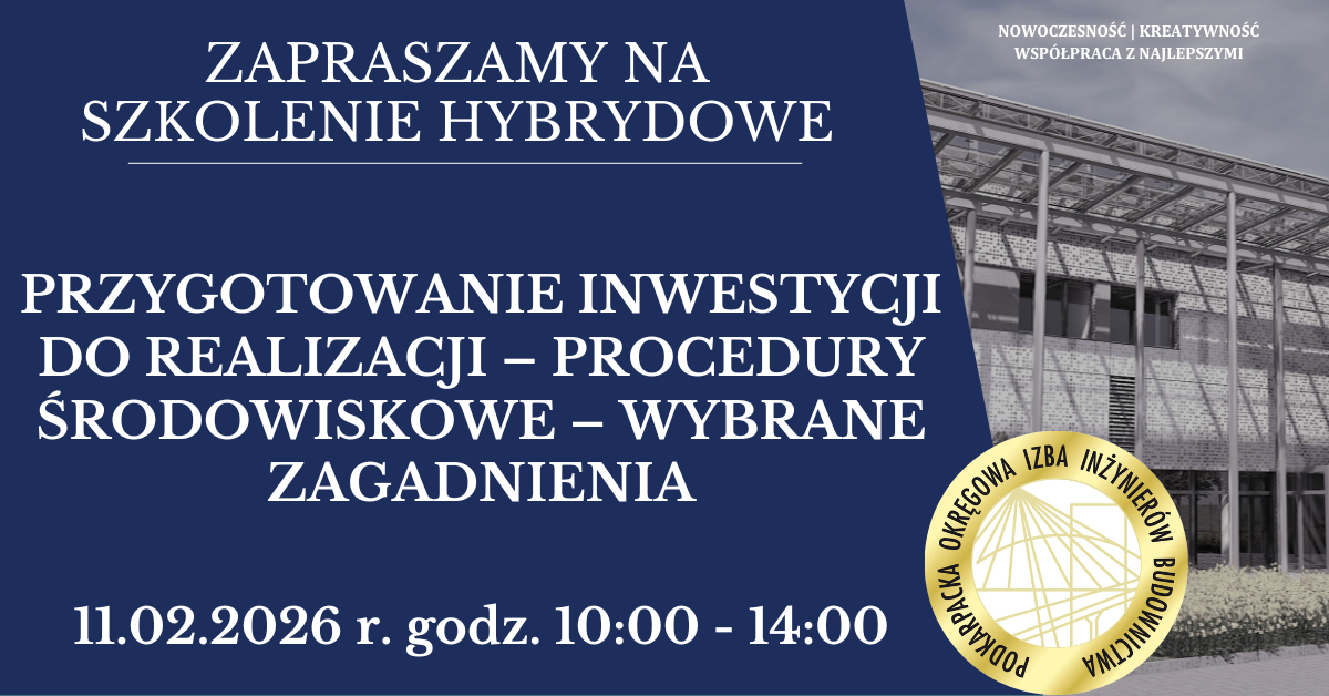 | Szkolenie hybrydowe PDK OIIB - Przygotowanie inwestycji do realizacji – procedury środowiskowe – wybrane zagadnienia - 11.02.2026 r. |