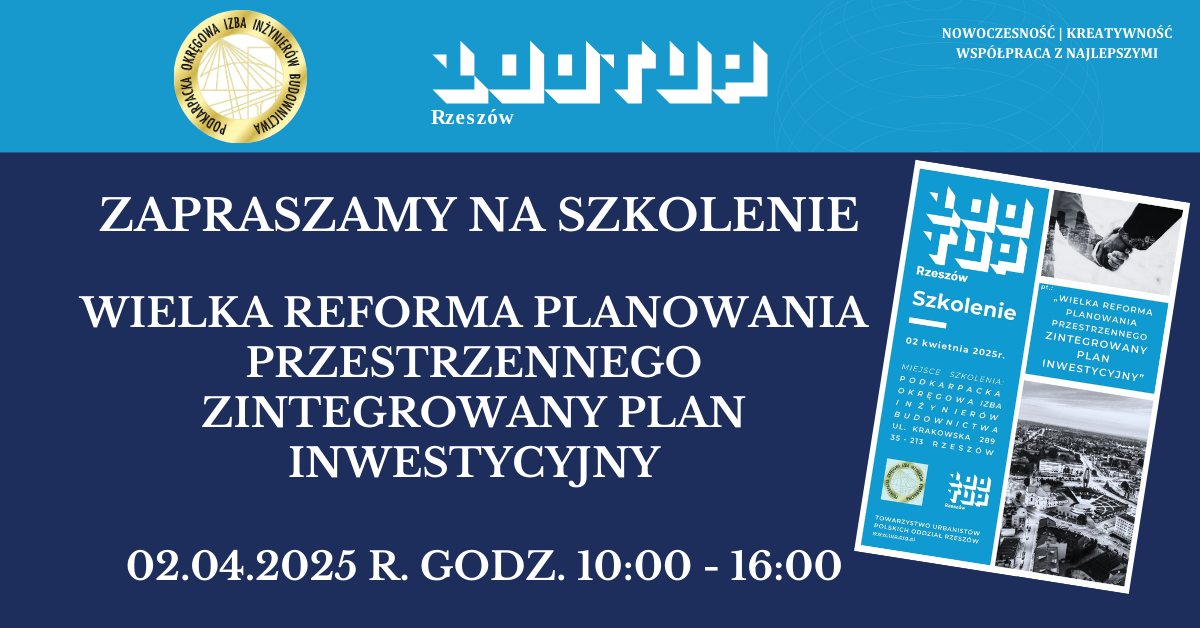 Towarzystwo Urbanistów Polskich Oddział w Rzeszowie pragnie zaprosić na szkolenie w formie stacjonarnej pt. „Wielka reforma planowania przestrzennego. Zintegrowany Plan Inwestycyjny" prowadzone przez prelegentów: - Joanna Dziedzic-Bukowska - radca prawny, doktor nauk prawnych, właścicielka kancelarii specjalizującej się w ... więcej » |