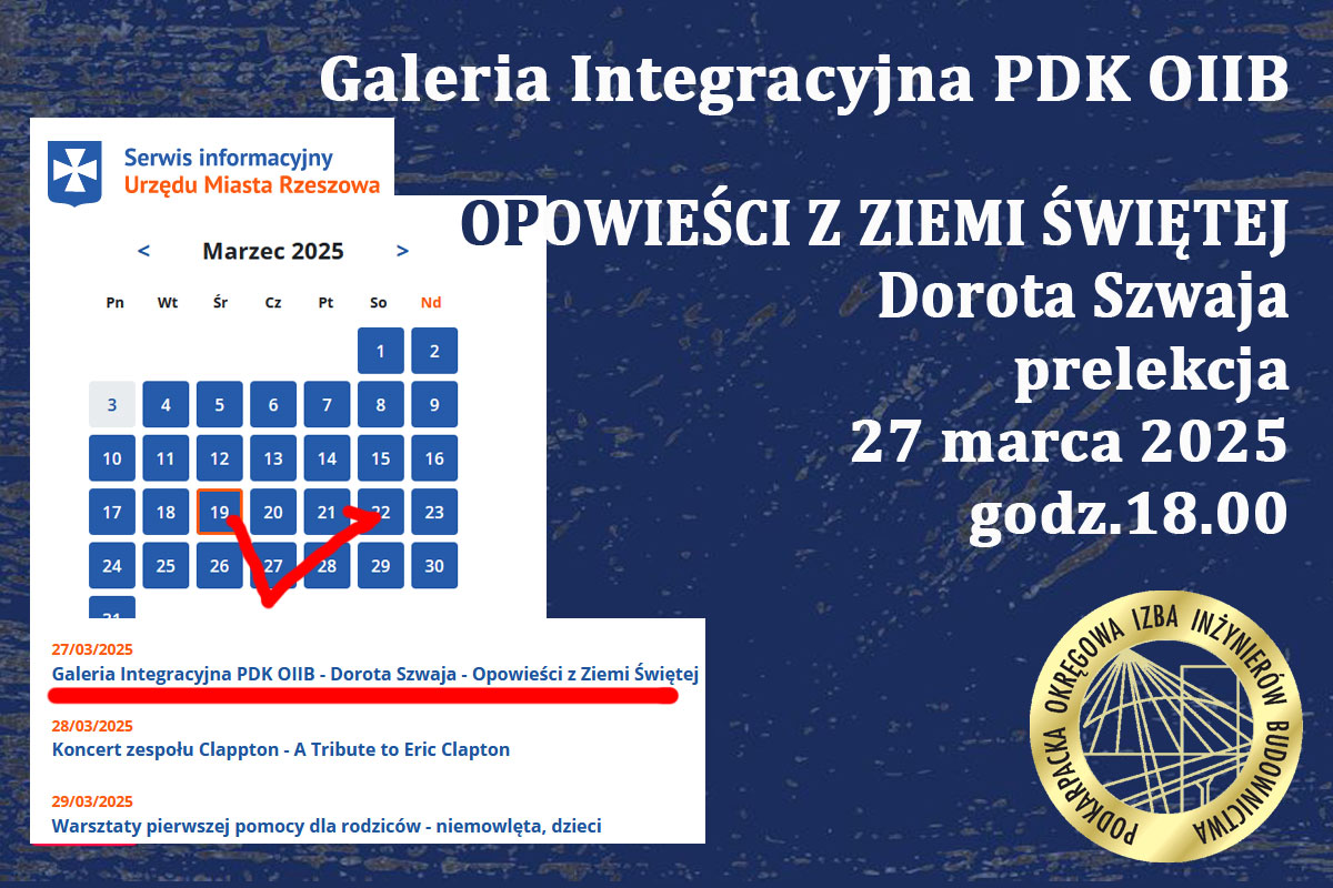 Podkarpacka Okręgowa Izba Inżynierów Budownictwa serdecznie zaprasza na wyjątkowe spotkanie z podróżniczką Dorotą Szwają, która zabierze nas w inspirującą podróż podczas prelekcji „Opowieści z Ziemi Świętej" w dniu 27 marca 2025 r. o godz. 18.00. Zapraszamy do artystycznej Galerii Integracyjnej PDK OIIB w Rzeszowie, ul. Krakowska 289. ...więcej>> |