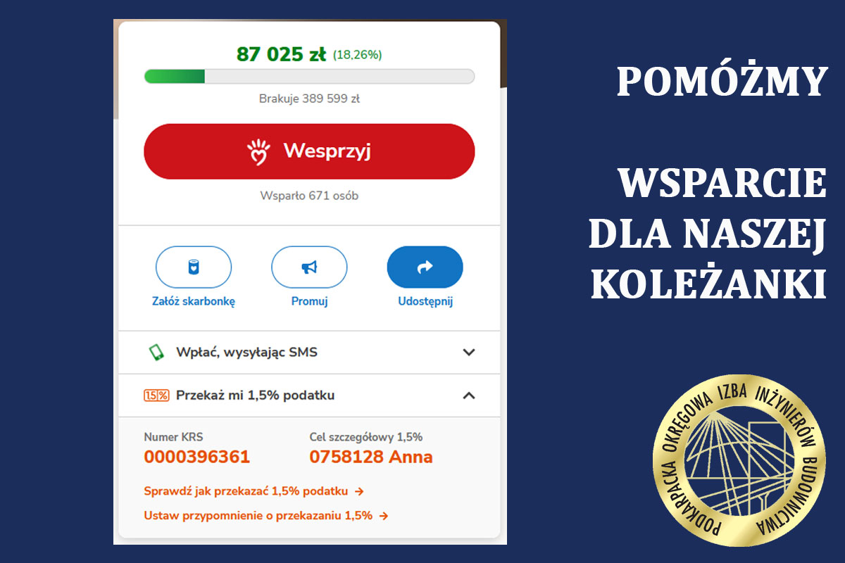 Zwracamy się z prośbą o wsparcie dla naszej koleżanki, inżynier branży sanitarnej. Jej słowa najlepiej oddają sytuację: Mam jedno, małe marzenie - pokonać glejaka. Marzą o tym również moi bliscy... Z całego serca proszę Was o pomoc. Wesprzyj moją zbiórkę i podziel się nią z innymi. Razem możemy uratować moje życie. Wierzymy, że jako środowisko inżynierów możemy razem pomóc i dać nadzieję na lepsze jutro. Każda, nawet najmniejsza pomoc, ma ogromne znaczenie. ...więcej>> |
