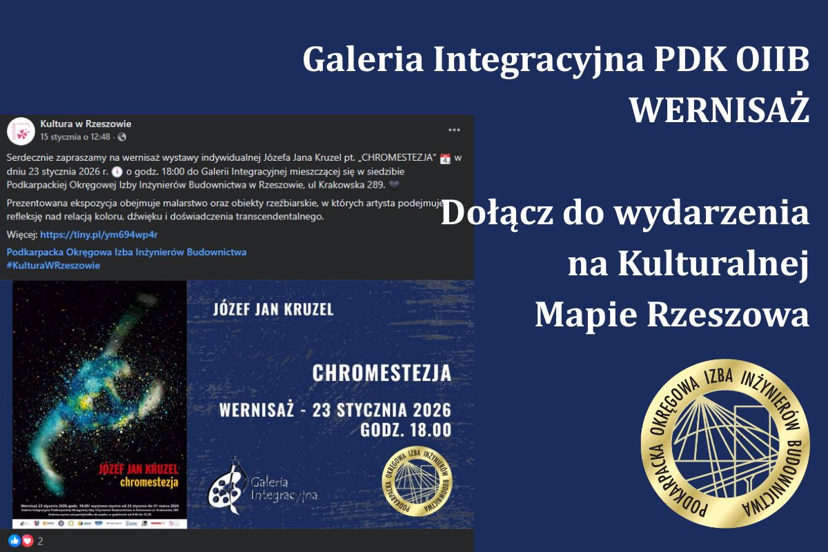 Serdecznie zapraszamy do Galerii Integracyjnej na otwarcie wyjątkowej, interdyscyplinarnej wystawy Józefa Jana Krużla pt. „CHROMESTEZJA". Zachęcamy również do śledzenia Kulturalnej Mapy Rzeszowa - oficjalnego kalendarza wydarzeń kulturalnych naszego miasta. To doskonały sposób, aby na bieżąco dołączać do ciekawych inicjatyw artystycznych, spotkań i wernisaży, które na co dzień kształtują kulturalne życie Rzeszowa. ...więcej>> |