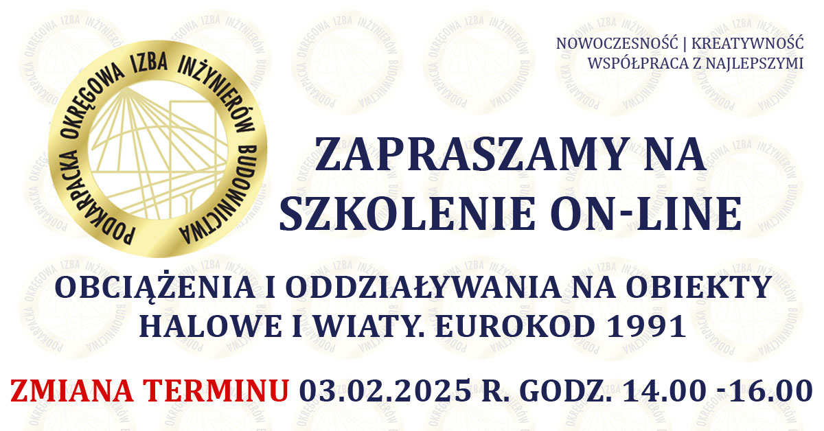 | Szkolenie on-line PDK OIIB - Obciążenia i oddziaływania na obiekty halowe i wiaty. Eurokod 1991. - 21.01.2025 r. zmiana terminu na 03.02.2025 r. |