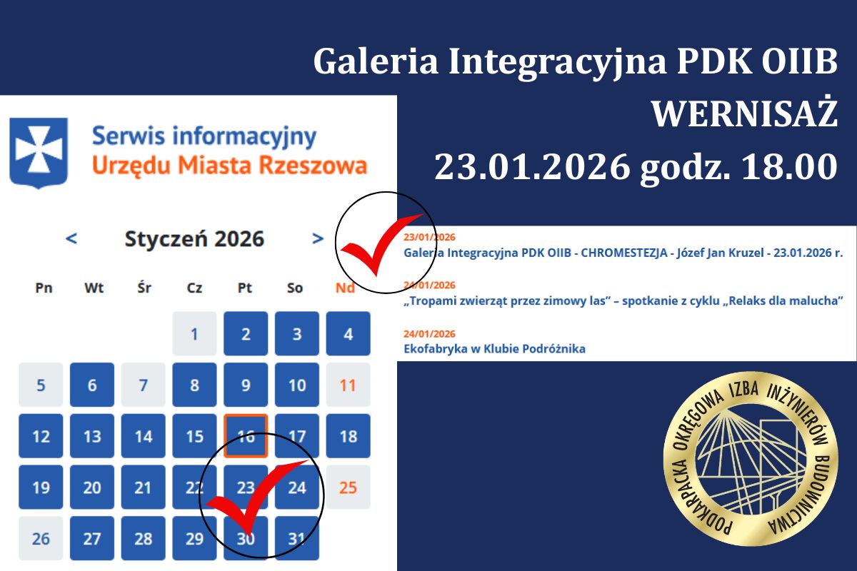 Serdecznie zapraszamy na wernisaż wystawy indywidualnej Józefa Jana Kruzel pt. „CHROMESTEZJA" w dniu 23 stycznia 2026 r. o godz. 18:00 do Galerii Integracyjnej mieszczącej się w siedzibie Podkarpackiej Okręgowej Izby Inżynierów Budownictwa w Rzeszowie, ul Krakowska 289. ...więcej >> |