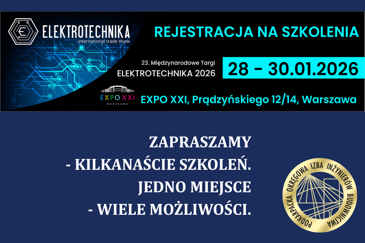 Podkarpacka Okręgowa Izba Inżynierów Budownictwa zaprasza członków PDK OIIB do udziału w kilkunastu szkoleniach organizowanych w ramach 23.Międzynarodowych Targów ELEKTROTECHNIKA 2026 i 33. Międzynarodowych Targów ŚWIATŁO 2026 w dniach 28-30 stycznia 2026 roku. Miejsce: Warszawa, EXPO XXI, ul. Prądzyńskiego 12/14. Tematyka szkoleń ... więcej »