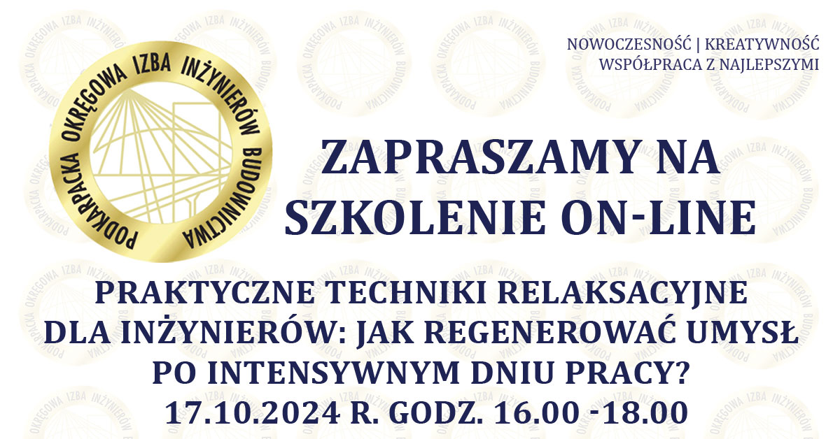 | Szkolenie on-line PDK OIIB - Praktyczne techniki relaksacyjne dla inżynierów: Jak regenerować umysł po intensywnym dniu pracy? -17.10.2024 r. |