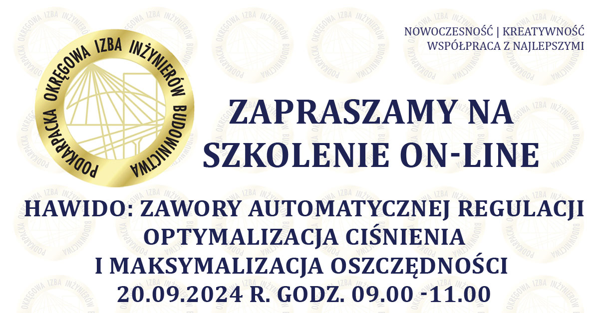 | Szkolenie on-line PDK OIIB - HAWIDO: zawory automatycznej regulacji - optymalizacja ciśnienia i maksymalizacja oszczędności - on-line - 20.09.2024 r. |