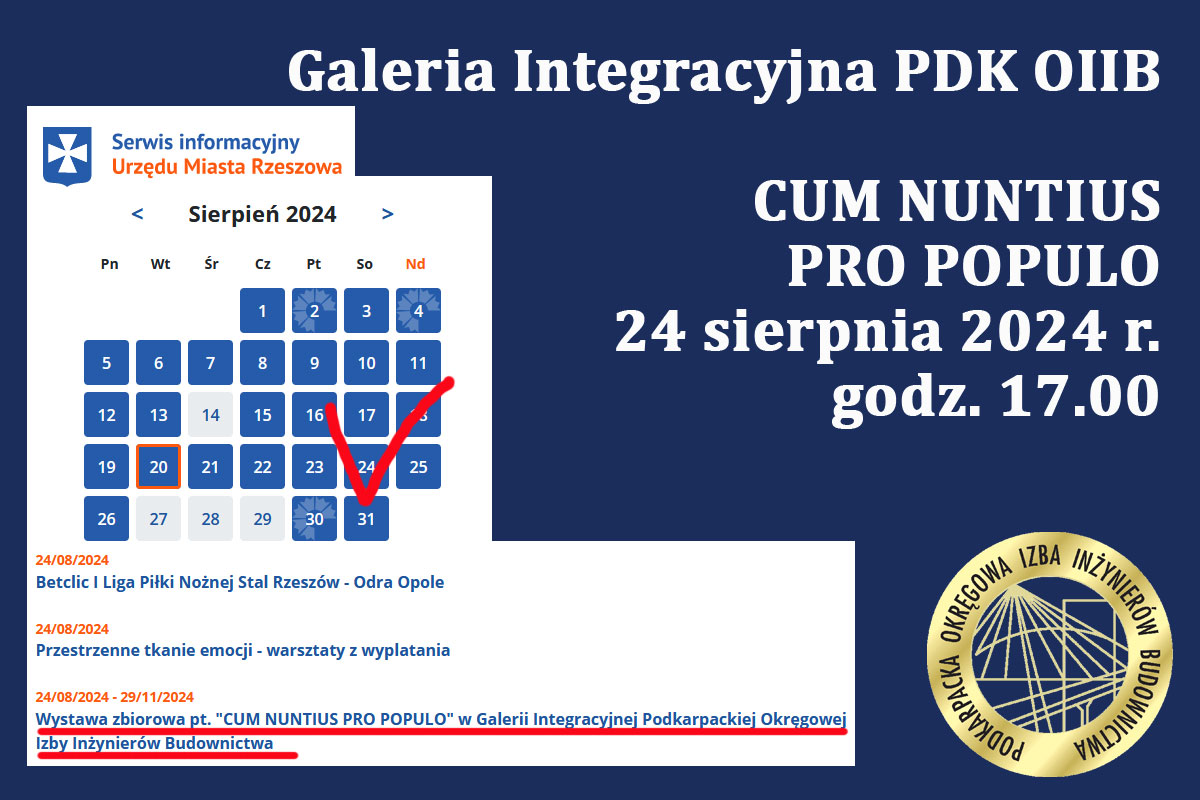 Wraz z Serwisem Urzędu Miasta Rzeszów serdecznie zapraszamy na wystawę zbiorową pt. "CUM NUNTIUS PRO POPULO". Wernisaż odbędzie się w dniu 24 sierpnia o godz. 17.00. Uroczysty finisaż odbędzie się w dniu 18 października 2024 r. o godz.18.00. ...więcej>> |